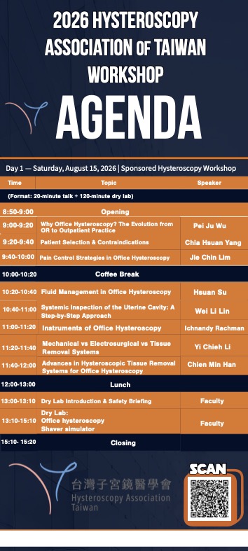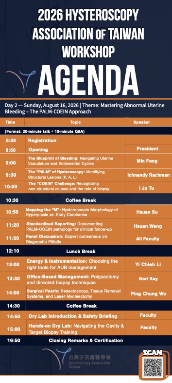 The 2026 Summer Symposium of the Hysteroscopy Association of Taiwan will be held on August 15–16. This year's symposium is themed "Mastering Abnormal Uterine Bleeding – The PALM-COEIN Approach," focusing on the diagnosis and management of abnormal uterine bleeding (AUB). Incorporating the PALM-COEIN classification system, the program will provide in-depth insights into the key role and clinical applications of hysteroscopy in gynecology.