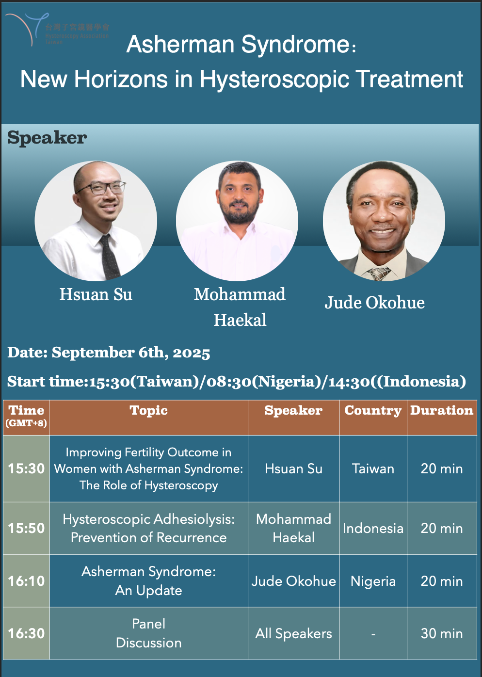本次演講將專注於 Asherman Syndrome的診斷、分類、治療及預後,邀請國際專家分享最新臨床經驗與技術發展,誠摯歡迎醫師們線上參加,共同精進專業知識。